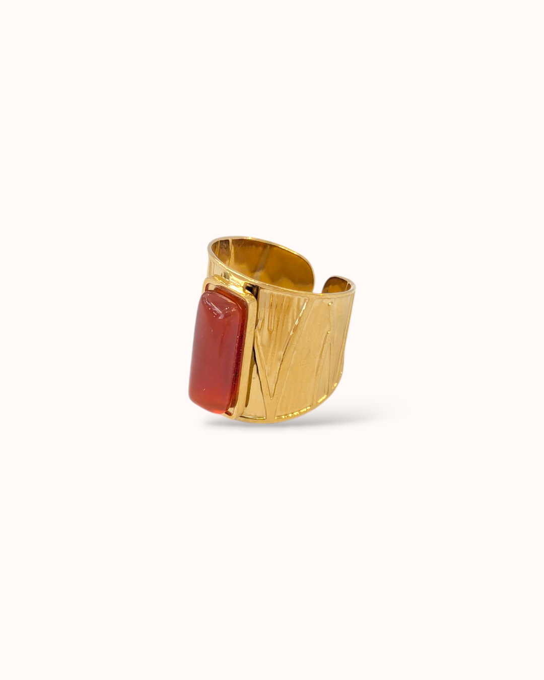Το Cinnamon Ring ξεχωρίζει με τη μακρόστενη πέτρα του σε βαθύ amber–terracotta χρώμα, μια απόχρωση που θυμίζει κανέλα λουσμένη στο φως του ήλιου. Ένα statement δαχτυλίδι που συνδυάζει κομψότητα και φυσική ζεστασιά, ιδανικό για όσες αγαπούν τα earthy tones και το ανεπιτήδευτο στυλ.